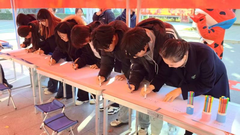 集体签字践诺:共筑无毒防线。11月19日,学院于太白湖校区南北餐厅之间开展禁毒宣传活动。济宁市戒毒所教育大队教导员、一级警长高红与该大队一级警员徐丛通过摆放展板、发放资料、现场答疑普及禁毒知识,带领学生在禁毒横幅上郑重签名,以实际行动践行“远离毒品”的承诺。